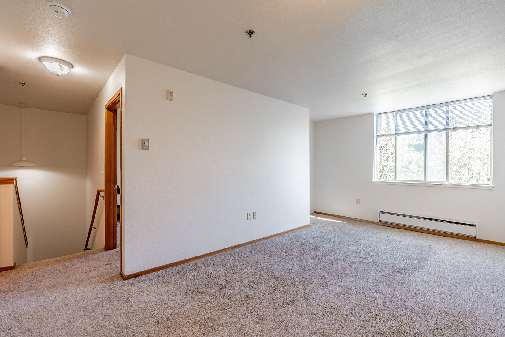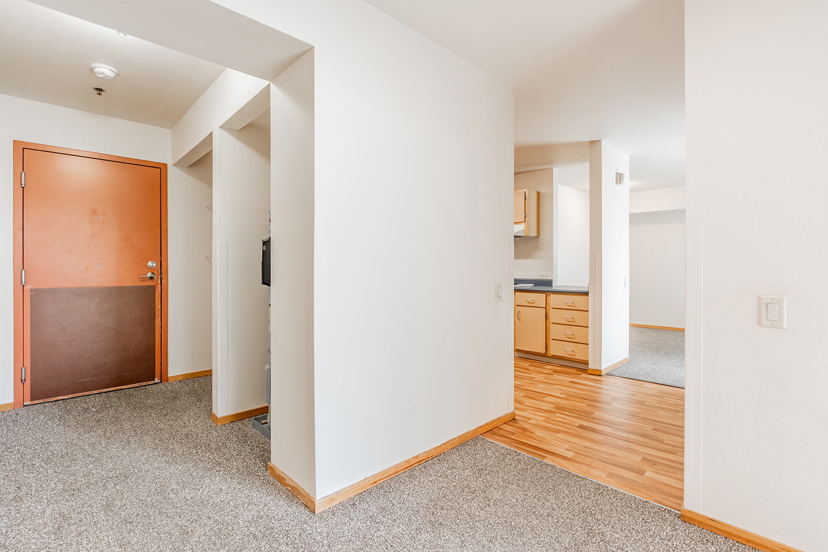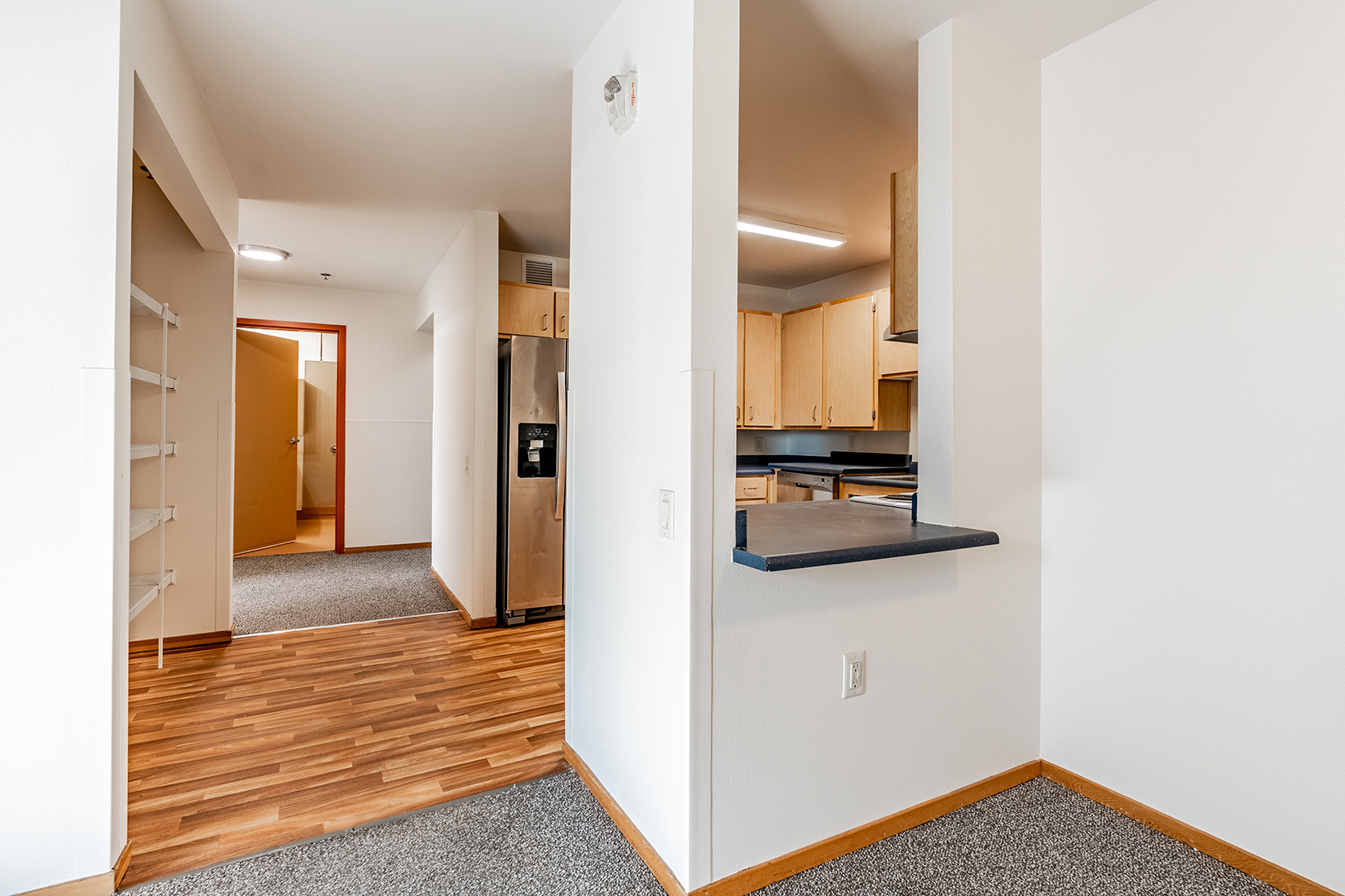 The beauty of a hardwood-look adds style, while carpet keeps rooms cozy.